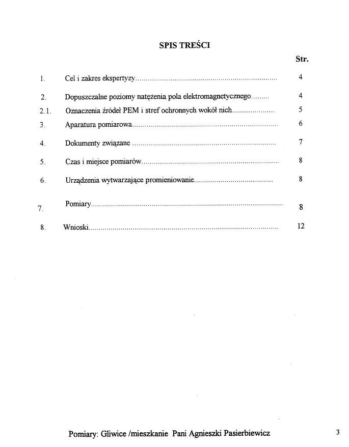Politechnika Wrocławska Instytut Telekomunikacji i Akustyki Raport nr I-28/S-032/01 Badanie Opromieniowania Mieszkania nr 38 w Gliwicach przy ul. Solskiego 3 przez stację telefonii komórkowej, mieszkanie Pani Agnieszki Pasierbiewicz, Wrocław, lipiec 20011. Cel i zakres ekspertyzy; 2. Dopuszczalne poziomy natężenia pola elektromagnetycznego; 2.1 Oznaczenia źródeł PEM i stref ochronnych wokół nich; 3. Aparatura pomiarowa; 4. Dokumenty związane; 5. Czas i miejsce pomiarów; 6. Urządzenia wytwarzające promieniowanie; 7. Pomiary; 8. Wnioski | |||||