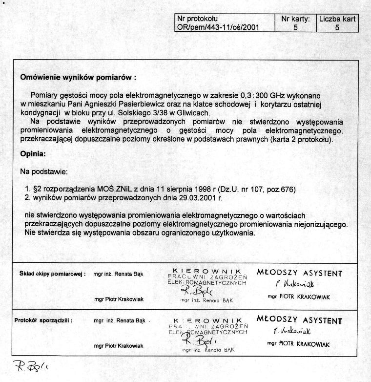 Śląska Wojewódzka Stacja Sanitarno-EpidemiologicznaOddział Ochrony Radiologicznej, Pracownia Zagrożeń Elektromagnetycznych ul. Raciborska 39, 40-957 Katowice 2 skrytka pocztowa 591 PROTOKÓŁ nr OR / pem / 433 - 11 / oś / 2001 Z POMIARÓW GĘSTOŚCI MOCY PROMIENIOWANIA ELEKTROMAGNETYCZNEGO O CZĘSTOTLIWOŚCI 300 MHz - 300 000 MHz wykonanych dla celów ochrony środowiska w mieszkaniu Pani Agnieszki Pasierbiewicz w Gliwicach, przy ul. Solskiego 3/38. Omówienie wyników pomiarów Pomiary gęstości mocy pola elektromagnetycznego w zakresie 0,3-300 GHz wykonano w mieszkaniu Pani Agnieszki Pasierbiewicz oraz na klatce schodowej i korytarzu ostatniej kondygnacji w bloku przy ul. Solskiego 3/38 w Gliwicach Opinia na podstawie: 1. §2 rozporządzenia MOŚ, ZNiL z dnia 11 sierpnia 1998 r. (Dz.U. nr 107, poz. 676) 2. wyników pomiarów przeprowadzonych dnia 29.03.2001 r. nie stwierdzono występowania promieniowania elektromagnetycznego o wartościach przekraczających dopuszczalne poziomy elektromagnetycznego promieniowania niejonizującego. Nie stwierdza się występowania obszaru ograniczonego użytkowania. | ||||