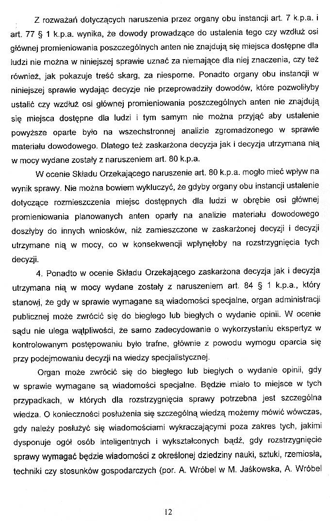 Lublin. Sygn. akt II SA/Lu 571/08 - Wyrok WSA w Lublinie, Data orzecz enia 2008-12-16, wpłynęło 09.01.2009r. Wynik: Uchylono decyzję I i II instancji, Uzasadnienie wyroku c.d. : W ocenie Składu Orzekającego uchybienie powyższe należy uznać za mogące w sposób istotny wpływać tak na rozstrzygniecie organu odwoławczego jak i organu pierwszej instancji. Nie można wszak wykluczyć, że podjęcie przez organy obu instancji czynności dowodowych zmierzających do ustalenia tego czy wzdłuż osi głównej promieniowania poszczególnych anten nie znajdują się miejsca dostępne dla ludzi, doprowadziłoby je do innych ustaleń niż te, które były podstawą sporządzenia opinii, a tym samym i do innego rozstrzygnięcia. Stowarzyszenie Ekologiczne Ojczyzna 58-105 Świdnica Lublin. Skarga o uchylenie Decyzji SKO z dnia 30.06.2008r. Załączniki do skargi Strona skarżąca: Stowarzyszenie Ekologiczne Ojczyzna 58-105 Świdnica Strona przeciwna: Samorządowe Kolegium Odwoławcze w Lublinie ul. Zana 38c |