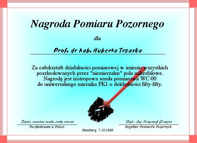 ![]() 7 października 2009 r. w Hamburgu plik do wydruku, .pdf, 397,7 ![]() Szanowny panie profesorze habilitowany doktorze inżynierze Hubercie Trzaska z Instytutu Telekomunikacji i Akustyki Politechniki Wrocławskiej. Za całokształt pańskiej działalności pomiarowej dostaje pan w imieniu wszystkich poszkodowanych przez "dopuszczalne i niemierzalne" pola mikrofalowe ustanowioną przeze mnie virtualną nagrodę pomiaru pozornego. Moje gratulacje Nagrodą jest izotropowa sonda pomiarowa WC-00 dla uniwersalnego miernika PK1 o dokładności fifty-fifty jak na obrazku u góry konstruktor miernika PK1 mgr inżynier-mechanik Krzysztof Puzyna Pozwalam sobie panu profesorowi tą nagrodę wirtualnie wręczyć | |||||||||||||||||||||