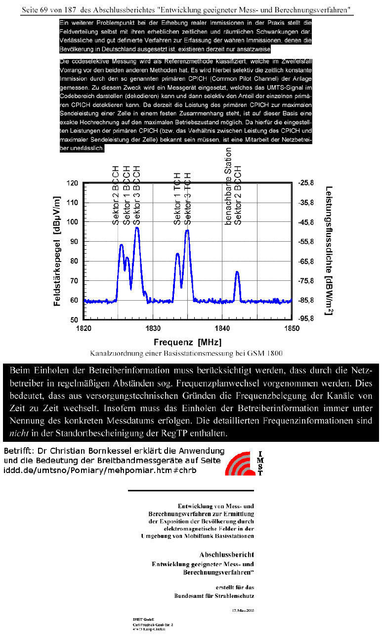 ![]() 22.7.2009 "Beim Einholen der Betreiberinformation muss berücksichtigt werden, dass durch die Netzbetreiber in regelmäßigen Abständen sog. Frequenzplanwechsel vorgenommen werden. Dies bedeutet. dass aus versorgungstechnischen Gründen die Frequenzbelegung der Kanäle von Zeit zu Zeit wechselt. Insofern muss das Einholen der Betreiberinformation immer unter Nennung des konkreten Messdatums erfolgen. Die detaillierten Frequenzinformationen sind nicht in der Standortbescheinigung der RegTP enthalten." Seite 69 des Abschlussberichtes wie unten von Dr Bornkessel, 2005 Krzysztof Puzyna: Ich habe nicht gehört, dass Dr. med. Cornelia Waldmann-Selsam Einwände zum Messbericht für BfS aus 66333 Völklingen, erstellt durch das Prüfzentrum EMV-Technik an der IMST GmbH hätte. Diese Messungen erfolgten nach Ihrer Initiative in einem exFachgespräch im Bundesamt für Strahlenschutz, Neuherberg, 02.08.2006. Leider den Teilnehmern der Mobilfunkgegnern irgendwie nicht bewußt wurde, dass um die Manipulation auszuschliessen die Betreiber nicht involviert werden dürften. Nach Dr Bornkessel ist das unbedingt nötig.. Man sollte das Thema ansprechen, wenn man den Betreibern und ihren Hofnarren Lug und Trug attestiert. | |||||||||||||||||||||