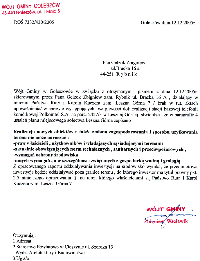 Z opracowanego raportu oddziaływania inwestycji na środowisko wynika, że przedmiotowa inwestycja będzie oddziaływać poza granice terenu, do którego inwestor ma tytuł prawny pkt. 2.5 niniejszego opracowania tj. na teren którego właścicielami są Państwo Ruta i Karol Kuczera zam. Leszna Góra 7