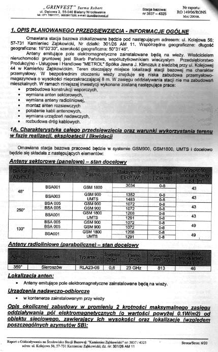 Opis planowanego przedsięwzięcia - informacje ogólne. Raport o oddziaływaniu przedsięwzięcia na środowisko nr RO 149/06/RONS rozbudowa stacji bazowej nr 3837/4325 "Kamieniec Ząbkowicki" PTK Centertel Orange (France Telecom) w Kamieńcu Ząbkowickim. EIRP "jest?" 15968 W (>100 W), Nr działki 301/26 AM 11, 57-731 Kamieniec Ząbkowicki, Kolejowa 56, autorem opracowania jest mgr inż. Robert Surma, mai 2006, Grinvest. puknięcie powoduje powiększenie | ||
