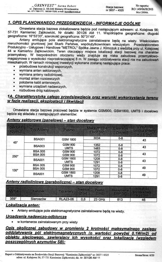 Opis planowanego przedsięwzięcia - informacje ogólne. Raport o oddziaływaniu przedsięwzięcia na środowisko nr RO 149/06/RONS rozbudowa stacji bazowej nr 3837/4325 "Kamieniec Ząbkowicki" PTK Centertel Orange (France Telecom) w Kamieńcu Ząbkowickim. EIRP "jest?" 15968 W (>100 W), Nr działki 301/26 AM 11, 57-731 Kamieniec Ząbkowicki, Kolejowa 56, autorem opracowania jest mgr inż. Robert Surma, mai 2006, Grinvest. | ||