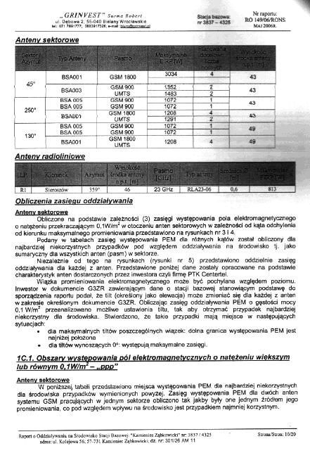 Anteny sektorowe, anteny radioliniowe, obliczenia zasięgu oddziaływania, obszary występowania pól EM o natężeniu większym niż 0,1 W/m2.. Raport o oddziaływaniu przedsięwzięcia na środowisko nr RO 149/06/RONS rozbudowa stacji bazowej nr 3837/4325 "Kamieniec Ząbkowicki" PTK Centertel Orange (France Telecom) w Kamieńcu Ząbkowickim. EIRP "jest?" 15968 W (>100 W), Nr działki 301/26 AM 11, 57-731 Kamieniec Ząbkowicki, Kolejowa 56, autorem opracowania jest mgr inż. Robert Surma, mai 2006, Grinvest. puknięcie powoduje powiększenie | ||