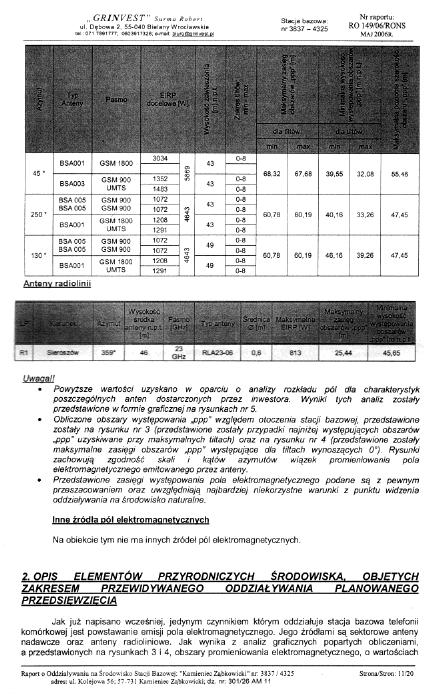 Anteny sektorowe, anteny radioliniowe, obliczenia zasięgu oddziaływania. Opis elementów przyrodniczych. Raport o oddziaływaniu przedsięwzięcia na środowisko nr RO 149/06/RONS rozbudowa stacji bazowej nr 3837/4325 "Kamieniec Ząbkowicki" PTK Centertel Orange (France Telecom) w Kamieńcu Ząbkowickim. EIRP "jest?" 15968 W (>100 W), Nr działki 301/26 AM 11, 57-731 Kamieniec Ząbkowicki, Kolejowa 56, autorem opracowania jest mgr inż. Robert Surma, mai 2006, Grinvest. puknięcie powoduje powiększenie | ||