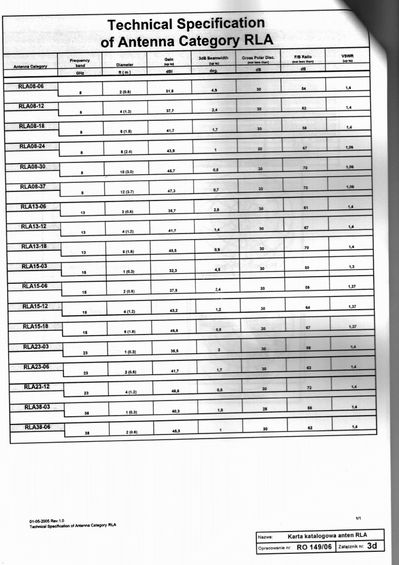 Technical Specification of Antenna Category RLA. Raport o oddziaływaniu przedsięwzięcia na środowisko nr RO 149/06/RONS rozbudowa stacji bazowej nr 3837/4325 "Kamieniec Ząbkowicki" PTK Centertel Orange (France Telecom) w Kamieńcu Ząbkowickim. EIRP "jest?" 15968 W (>100 W), Nr działki 301/26 AM 11, 57-731 Kamieniec Ząbkowicki, Kolejowa 56, autorem opracowania jest mgr inż. Robert Surma, mai 2006, Grinvest. | ||