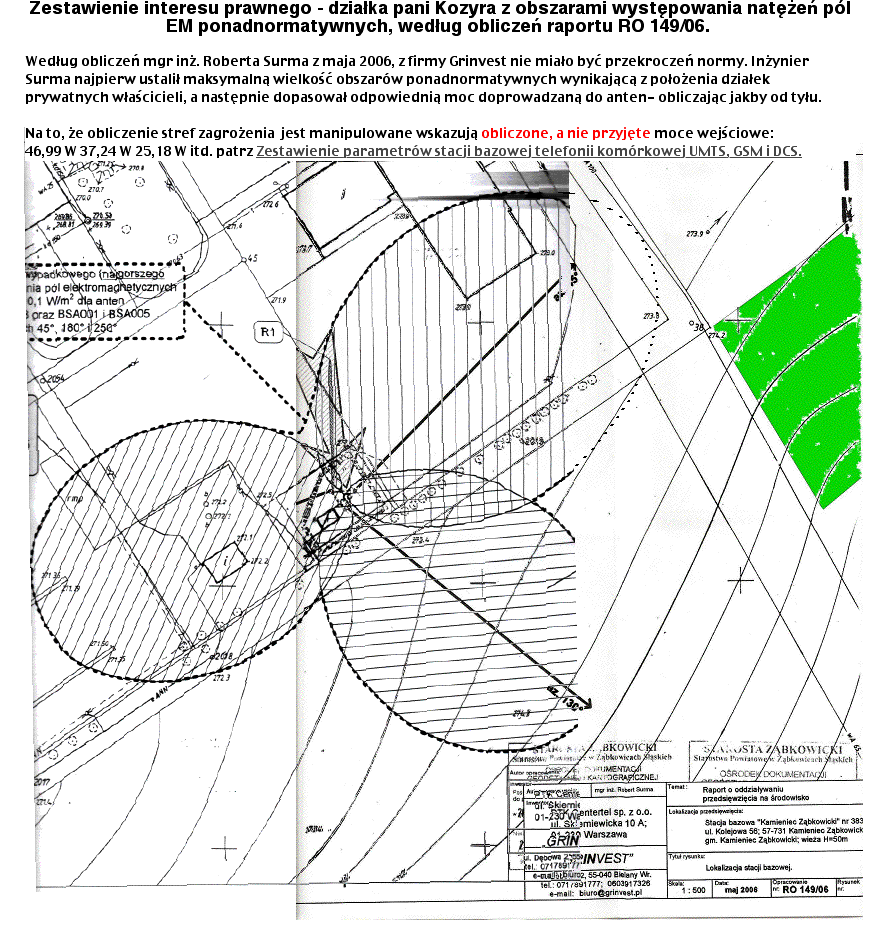 Zestawienie interesu prawnego - działka pani Kozyra z obszarami występowania natężeń pól EM ponadnormatywnych. Raport o oddziaływaniu przedsięwzięcia na środowisko nr RO 149/06/RONS rozbudowa stacji bazowej nr 3837/4325 "Kamieniec Ząbkowicki" PTK Centertel Orange (France Telecom) w Kamieńcu Ząbkowickim. EIRP "jest?" 15968 W (>100 W), Nr działki 301/26 AM 11, 57-731 Kamieniec Ząbkowicki, Kolejowa 56, autorem opracowania jest mgr inż. Robert Surma, mai 2006, Grinvest. | ||