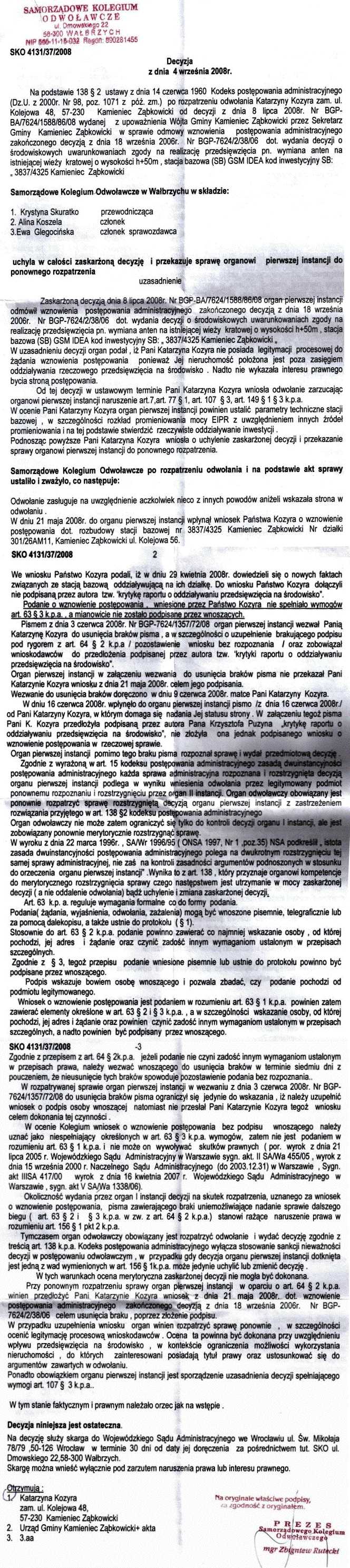 Wałbrzych, 4 września 2008r. SKO 4131/37/2008 Decyzja z dnia 4 września 2008r. Na podstawie 138 § 2 ustawy z dnia 14 czewca 1960 Kodeks postępowania administracyjnego (Dz.U. z 2000r. Nr 98, poz. 1071 z póź. zm.) po rozpatrzeniu odwołania Katarzyny Kozyra zam. ul. Kolejowa 48, 57-230 Kamieniec Ząbkowicki od decyzji z dnia 8 lipca 2008r. Nr BGP-7624/1588/86/08 wydanej z upoważnienia Wójta Gminy Kamieniec Ząbkowicki przez Sekretarz Gminy Kamieniec Ząbkowicki w sprawie odmowy wznowienia postępowania administracyjnego zakończonego decyzją z dnia 18 września 2006r. Nr BGP-7624/2/38/06 dotyczących wydania decyzji o środowiskowych uwarunkowań zgody na realizację przedsięwzięcia pod nazwą Wymiana anten na istniejącej wieży kratowej o wysokości h+50m, stacja bazowa (SB) GSM IDEA kod inwestycyjny SB: 3837/4325 Kamieniec Ząbkowicki, Samorządowe Kolegium Odwoławcze w Wałbrzychu w składzie 1. Krystyna Skuratko przewodnicząca 2. Alina Koszela członek 3. Ewa Glegocińska członek sprawozdawca uchyla w całości zaskarżoną decyzję i przekazuje sprawę organowi pierwszej instancji do ponownego rozpatrzenia | ||