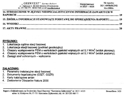 Spis treści ciąg dalszy. Raport o oddziaływaniu przedsięwzięcia na środowisko nr RO 149/06/RONS rozbudowa stacji bazowej nr 3837/4325 "Kamieniec Ząbkowicki" PTK Centertel Orange (France Telecom) w Kamieńcu Ząbkowickim. EIRP "jest?" 15968 W (>100 W), Nr działki 301/26 AM 11, 57-731 Kamieniec Ząbkowicki, Kolejowa 56, autorem opracowania jest mgr inż. Robert Surma, mai 2006, Grinvest. puknięcie powoduje powiększenie | ||