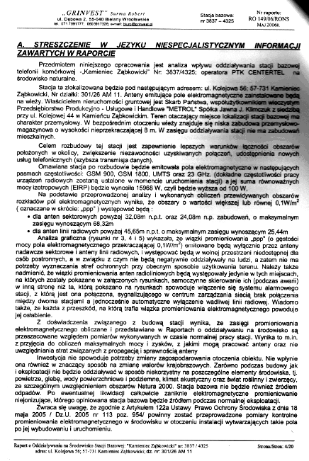 Streszczenie w języku niespecjalistycznym informacji zawartych w raporcie. Raport o oddziaływaniu przedsięwzięcia na środowisko nr RO 149/06/RONS rozbudowa stacji bazowej nr 3837/4325 "Kamieniec Ząbkowicki" PTK Centertel Orange (France Telecom) w Kamieńcu Ząbkowickim. EIRP "jest?" 15968 W (>100 W), Nr działki 301/26 AM 11, 57-731 Kamieniec Ząbkowicki, Kolejowa 56, autorem opracowania jest mgr inż. Robert Surma, mai 2006, Grinvest. puknięcie powoduje powiększenie | ||