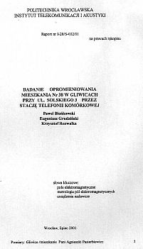 Politechnika Wrocławska Instytut Telekomunikacji i Akustyki Raport nr I-28/S-032/01 Badanie Opromieniowania Mieszkania nr 38 w Gliwicach przy ul. Solskiego 3 przez stację telefonii komórkowej, mieszkanie Pani Agnieszki Pasierbiewicz, Wrocław, lipiec 20011. Cel i zakres ekspertyzy; 2. Dopuszczalne poziomy natężenia pola elektromagnetycznego; 2.1 Oznaczenia źródeł PEM i stref ochronnych wokół nich; 3. Aparatura pomiarowa; 4. Dokumenty związane; 5. Czas i miejsce pomiarów; 6. Urządzenia wytwarzające promieniowanie; 7. Pomiary; 8. Wnioski | |||||