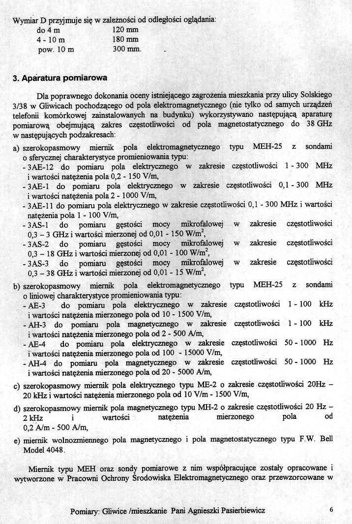 Politechnika Wrocławska Instytut Telekomunikacji i Akustyki Raport nr I-28/S-032/01 Badanie Opromieniowania Mieszkania nr 38 w Gliwicach przy ul. Solskiego 3 przez stację telefonii komórkowej, mieszkanie Pani Agnieszki Pasierbiewicz, Wrocław, lipiec 20013. Aparatura pomiarowa szerokopasmowy miernik pola elektromagnetycznego typu MEH-25 z sondami o sferycznej charakterystyce promieniowania typu: - 3AE-12 - 3AE-1 - 3AE-11 - 3AS-1 - 3AS-2 - 3AS-3 szerokopasmowy miernik pola elektromagnetycznego typu MEH-25 z sondami o liniowej charakterystyce promieniowania typu: - AE-3 - AH-3 - AE-4 - AH-4 szerokopasmowy miernik pola elektrycznego typu ME-2 o zakresie częstotliwości 20 Hz - 2 kHz i wartości natężenia mierzonego pola od 0,2 A/m - 500 A/m Miernik wolnozmiennego pola magnetycznego i pola magnetostatycznego typu F.W. Bell Model 4048 | |||||