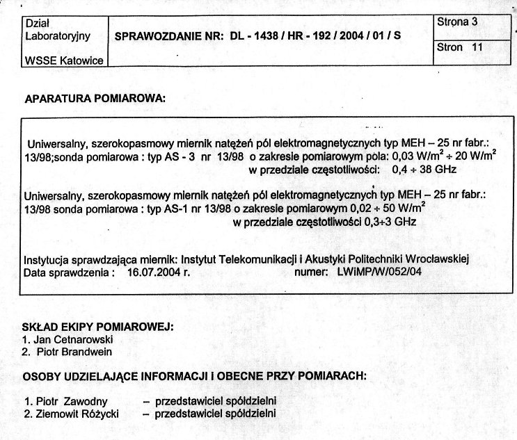 Wojewódzka Stacja Sanitarno-Epidemiologiczna w Katowicachul. Raciborska 39, 40-957 Katowice 2 skrytka pocztowa 591 Dział Laboratoryjny Oddział Badań Higieny Radiacyjnej Sprawozdanie nr: DL - 1438 / HR - 192 / 2004 / 01/ S Temat: POMIAR GĘSTOŚCI MOCY PROMIENIOWANIA ELEKTROMAGNETYCZNEGO w zakresie 0,3 GHz - 38 GHz dla środowiska. Klient: Spółdzielnia Mieszkaniowa Śródmieście 44-100 Gliwice, ul. Jasnogórska 9 Aparatura Pomiarowa: Uniwersalny szerokopasmowy miernik natężeń pól elektromagnetycznych typ MEH - 25 nr fabr.: 13/98; sonda pomiarowa: typ AS - 3 nr 13/98 o zakresie pomiarowym pola 0,03 W/m2 - 20 W/m2 w przedziale częstotliwości: 0,4 - 38 GHz Uniwersalny, szerokopasmowy miernik natężeń pól elektromagnetycznych typ MEH - 25 nr fabr.: 13/98; sonda pomiarowa: typ AS - 1 nr 13/98 o zakresie pomiarowym pola 0,02 W/m2 - 50 W/m2 w przedziale częstotliwości: 0,3 - 3 GHz Instytucja sprawdzająca miernik: Instytut Telekomunikacji i Akustyki politechniki Wrocławskiej Data sprawdzenia: 16.07.2004 r. numer: LWiMP/W/052/04 Skład ekipy pomiarowej: Jan Cetnarowski Piotr Brandwein Osoby udzielające informacji i obecne przy pomiarach: Piotr Zawodny - przedstawiciel spółdzielni Ziemowit Różycki - przedstawiciel spółdzielni | |||||