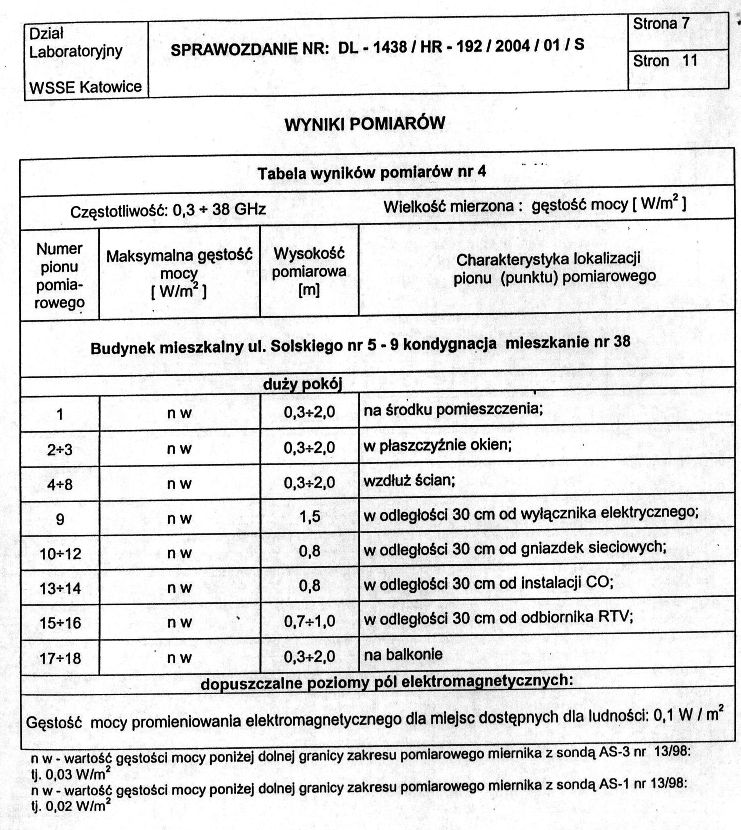 Wojewódzka Stacja Sanitarno-Epidemiologiczna w Katowicachul. Raciborska 39, 40-957 Katowice 2 skrytka pocztowa 591 Dział Laboratoryjny Oddział Badań Higieny Radiacyjnej Sprawozdanie nr: DL - 1438 / HR - 192 / 2004 / 01/ S Temat: POMIAR GĘSTOŚCI MOCY PROMIENIOWANIA ELEKTROMAGNETYCZNEGO w zakresie 0,3 GHz - 38 GHz dla środowiska. Klient: Spółdzielnia Mieszkaniowa Śródmieście 44-100 Gliwice, ul. Jasnogórska 9 Wyniki pomiarów, tabela wyników nr 4, budynek mieszkalny ul. Solskiego nr 5 - 9 kondygnacja mieszkanie nr 38, duży pokój Dopuszczalne poziomy pól elektromagnetycznych gęstość mocy promieniowania elektromagnetycznego dla miejsc dostępnych dla ludności: 0,1 W / m2 nw - wartość gęstości mocy poniżej dolnej granicy zakresu pomiarowego miernika z sondą AS-3 nr 13/98: tj. 0,03 W/m2 nw - wartość gęstości mocy poniżej dolnej granicy zakresu pomiarowego miernika z sondą AS-1 nr 13/98: tj. 0,02 W/m2 | |||||