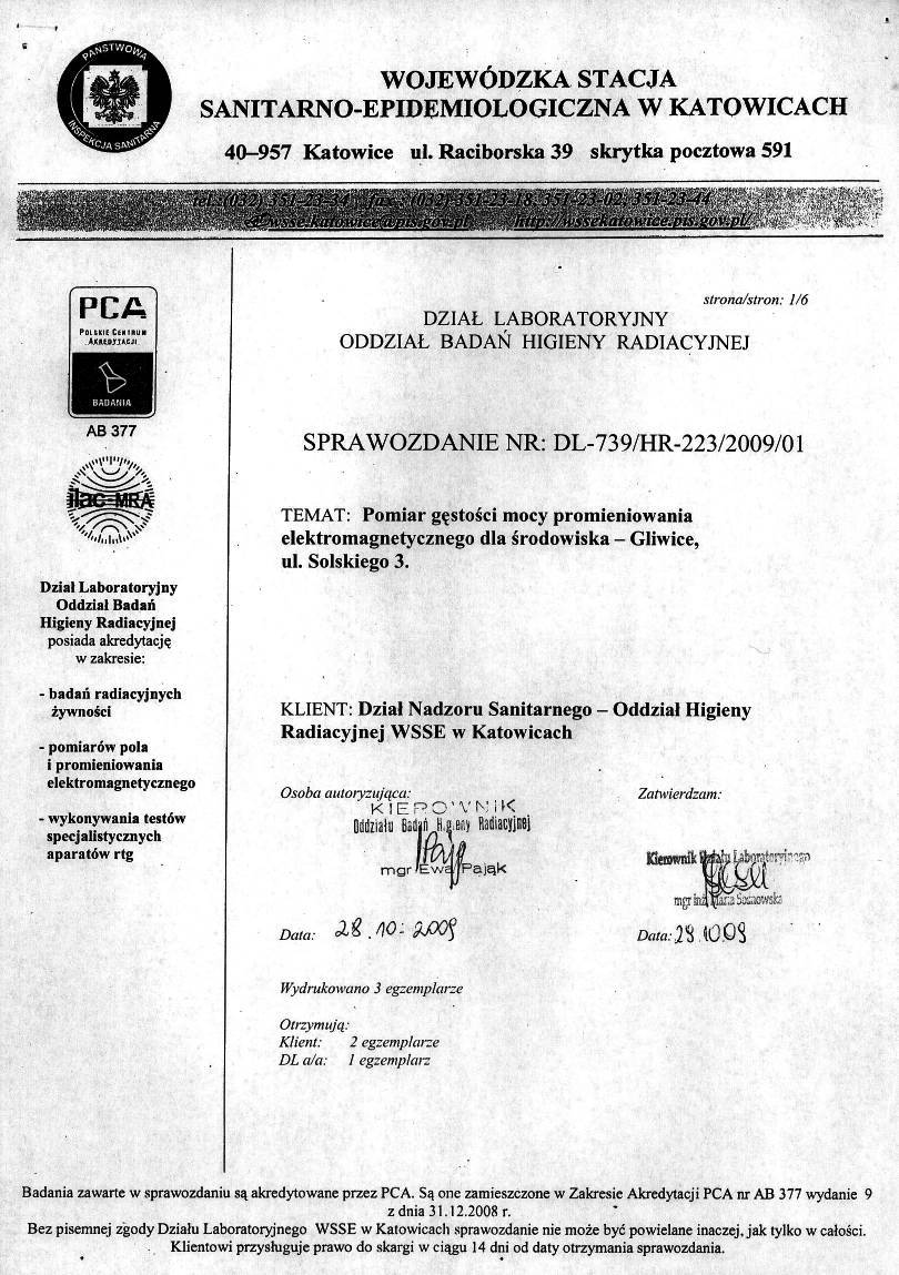 Wojewódzka Stacja Sanitarno-Epidemiologiczna w Katowicach40-957 Katowice ul. Raciborska 39 skrytka pocztowa 591 tel.: (032) 351-23-34 fax: (032) 351-23-18 351-23-02 351-23-44 wsse.katowice@pis.gov.pl http://wsse.katowice.pis.gov.pl/ Dział Laboratoryjny, Oddział Badań Higieny Radiacyjnej, Sprawozdanie nr: DL-739/HR-223/2009/01 Temat: Pomiar Gęstości Mocy Promieniowania Elektromagnetycznego dla środowiska - Gliwice, ul. Solskiego 3 Klient: Dział Nadzoru Sanitarnego - Odział Higieny Radiacyjnej WSSE w Katowicach osoba autoryzująca: Kierownik Oddziału Badań Higieny Radiacyjnej mgr Ewa Pająk Data: 28.10.2009 Kierownik Działu Laboratoryjnego mgr inż. Maria Sosnowska Data: 29.10.2009 Badania zawarte w sprawozdaniu są akredytowane przez Polskie Centrum Akredytacji (PCA). Są one zamieszczone w Zakresie Akredytacji PCA nr AB 377 wydanie 9 z dnia 31.12.2008 r. sprawozdanie nr DL-739/HR-223/2009/01 | |||||