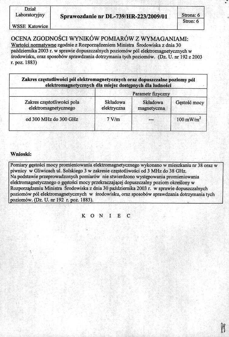 Wojewódzka Stacja Sanitarno-Epidemiologiczna w Katowicach40-957 Katowice ul. Raciborska 39 skrytka pocztowa 591 tel.: (032) 351-23-34 fax: (032) 351-23-18 351-23-02 351-23-44 wsse.katowice@pis.gov.pl http://wsse.katowice.pis.gov.pl/ Dział Laboratoryjny, Oddział Badań Higieny Radiacyjnej, Sprawozdanie nr: DL-739/HR-223/2009/01 Temat: Pomiar Gęstości Mocy Promieniowania Elektromagnetycznego dla środowiska - Gliwice, ul. Solskiego 3 Ocena zgodności wyników pomiarów z wymaganiami: Wartości normatywne zgodnie z Rozporządzeniem Ministra Środowiska z dnia 30 października 2003 r. w sprawie dopuszczalnych poziomów pól elektromagnetycznych w środowisku, oraz sposobów sprawdzania dotrzymania tych poziomów. (Dz. U. nr 192 z 2003 r. poz. 1883) Zakres częstotliwości pól elektromagnetycznych oraz dopuszczalne poziomy pól elektromagnetycznych dla miejsc dostępnych dla ludności. Zakres częstotliwości pola elektromagnetycznego od 300 MHz do 300 GHz Składowa elektryczna 7 V/m gęstość mocy 100 mW/m2 Wnioski Pomiary gęstości mocy promieniowania elektromagnetycznego wykonano w mieszkaniu nr 38 oraz w piwnicy w Gliwicach ul. Solskiego 3 w zakresie częstotliwości od 3MHz do 38 GHz. Na podstawie przeprowadzonych pomiarów nie stwierdzono występowania promieniowania elektromagnetycznego o gęstości mocy przekraczającej dopuszczalny poziom określony w Rozporządzeniu Ministra Środowiska z dnia 30 października 2003 r. w sprawie dopuszczalnych poziomów pól elektromagnetycznych w środowisku, oraz sposobów sprawdzania dotrzymania tych poziomów. (Dz.U. nr 192 z 2003 r. poz. 1883). | ||||