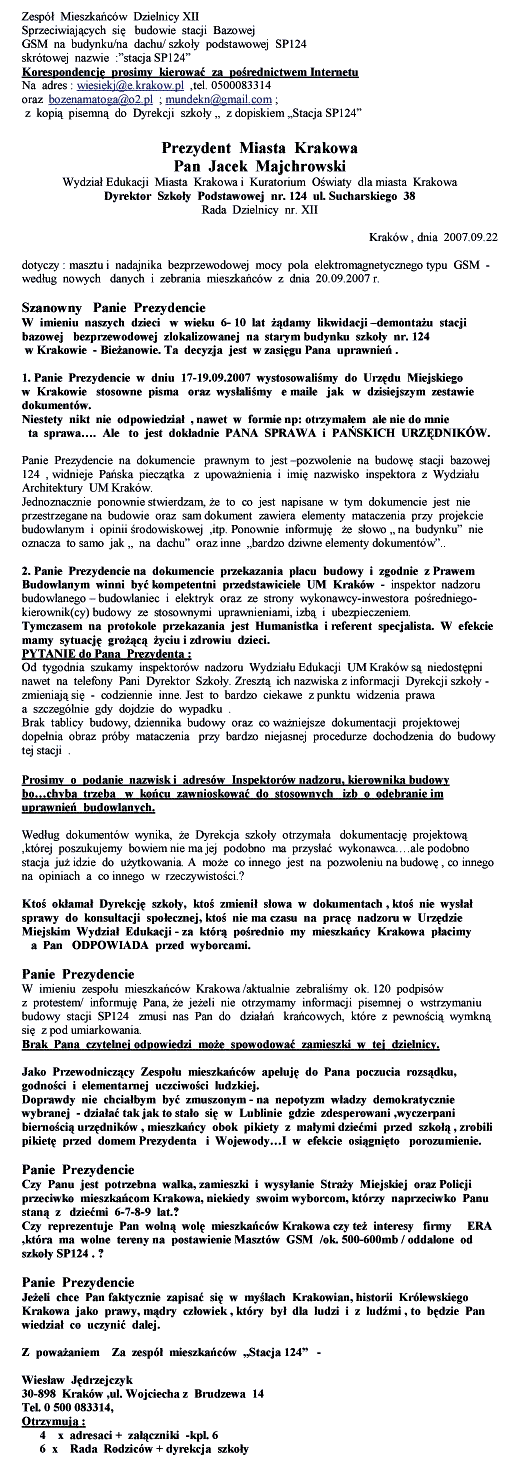 Prezydent Miasta Krakowa Pan Jacek Majchrowski ![]() Panie Prezydencie Czy Panu jest potrzebna walka, zamieszki i wysyłanie Straży Miejskiej oraz Policji przeciwko mieszkańcom Krakowa, niekiedy swoim wyborcom, którzy naprzeciwko Panu staną z dziećmi 6-7-8-9 lat? Czy reprezentuje Pan wolną wolę mieszkańców Krakowa czy też interesy firmy (niemieckiej- uwaga umtsno) ERA, która ma wolne tereny na postawienie Masztów GSM/ ok. 500-600 mb/ oddalone od szkoły SP124 ? |