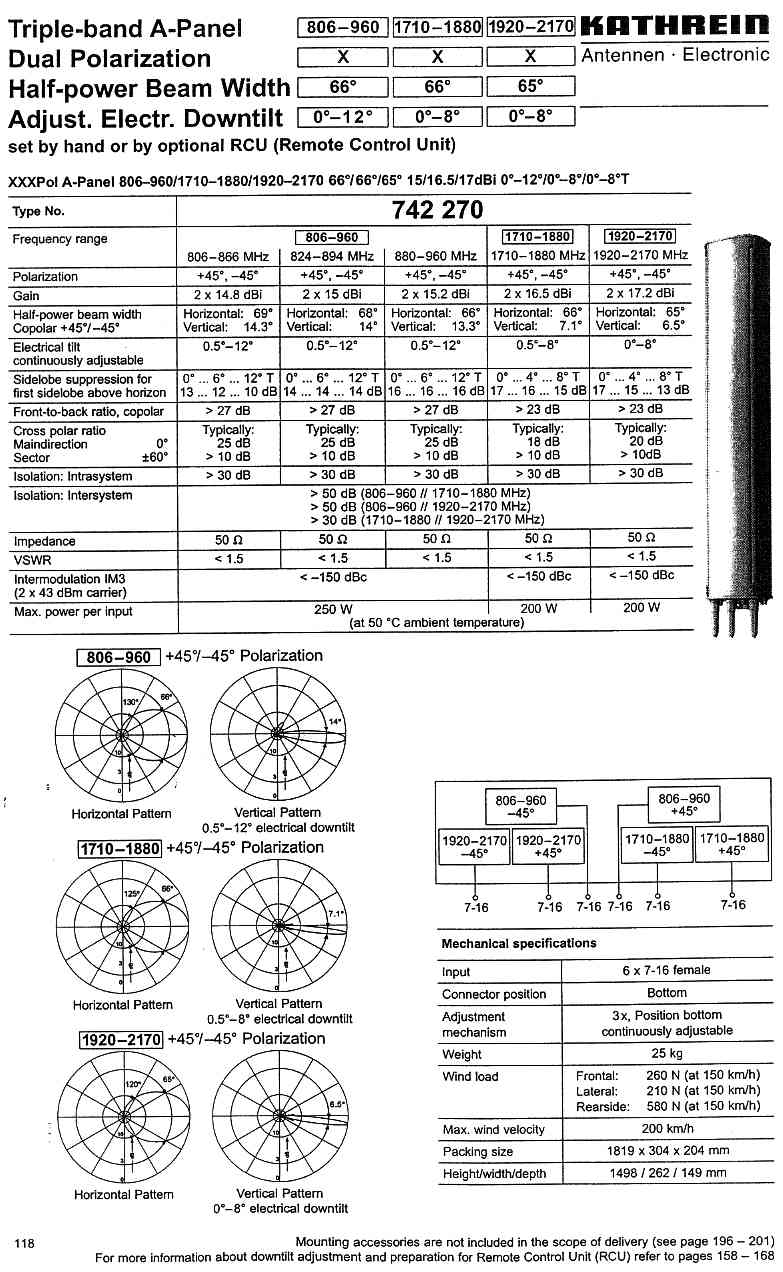 Lublin, Raport o oddziaływaniu na środowisko, Kathrein Tripleband A-Panel 1710-1880 Adjust. Electrical Downtilt set by hand or by optional (RCU Remote Control Unit) ERA Nr 27063 Lublin-LSM str 30 |