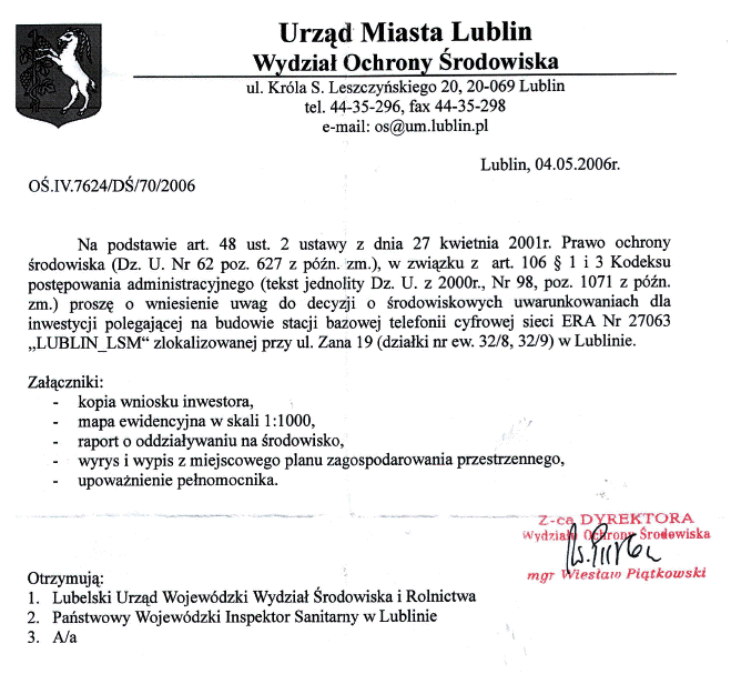 19 maja 2006, postanowienie PWIS, uzgadniam środowiskowe uwarunkowania dla ERA Nr 27063 Lublin-LSM