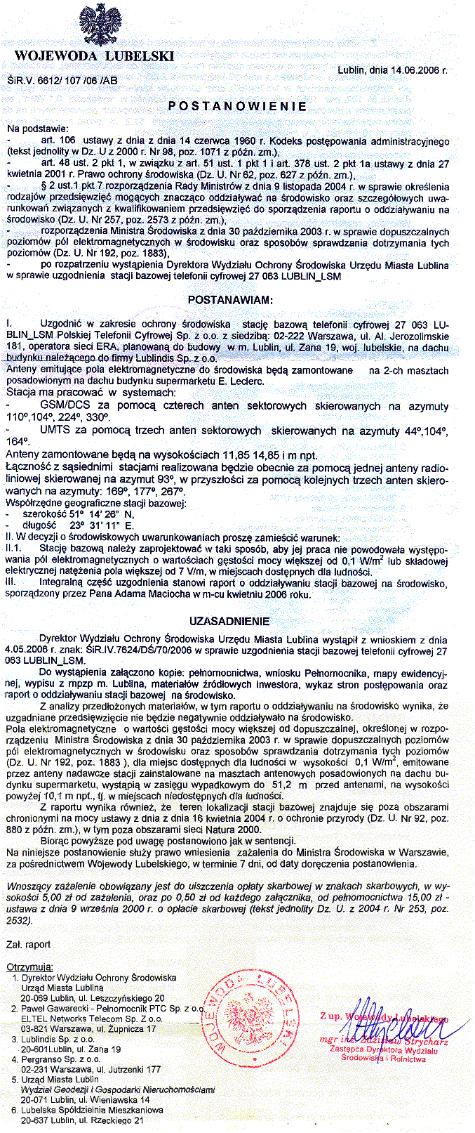 Lublin, strona główna Położenie Lublina Lublin, Folwarczna 37 4 maj 2006 r., Wydział Ochrony Środowiska zawiadomienie o postępowaniu administracyjnym 4 maj 2006 r., Wydział Ochrony Środowiska, prośba o uwagi przez wydział Środowiska i Rolnictwa oraz przez PWIS w Lublinie 13 maja, walka z inwazją Ery w Lublinie, hipermarket E. Leclerc Hipermarket E. Leclerc, mapa sytuacji 19 maja 2006, postanowienie PWIS, uzgadniam środowiskowe uwarunkowania dla ERA Nr 27063 Lublin-LSM 5 czerwca 2006 r., prośba PWIS o wydanie raportu 14 czerwca 2006 r., postanowienie Wojewody Lubelskiego 16 czerwca 2006 r., odpowiedź prezydenta miasta Lublin 20 czerwca 2006 r., przekazanie pisma przeciwników budowy masztów ERY do Prezydenta Miasta Lublin Andrzeja Pruszkowskiego Lublin, zdjęcia sytuacji Szczegół, który robi z raportów makulaturę Raport o oddziaływaniu na środowisko, Zana 19, Lublin 17 lipca 2006 r. pismo przedstawiciela 1000 protestujących osób pana Remigiusza Dąbrowa-Karasińskiego do Prezesa Lubelskiej Spółdzielni Mieszkaniowej, .doc, 28 KB 18 lipca 2006 r., Lubelska Spółdzielnia Mieszkanowa zażalenie na postanowienie wojewody lubelskiego z dnia 14.6.2006 r. exTaktyka falszowania raportów Lipiec 2006 r., w sprawie opracowania: "Raport oddziaływania na środowisko" , doc, 272,7 KB 19 lipca 2006, Prezes Spółki "Lublindis" wnosi zażalenie na postanowienie wojewody lubelskiego 26 lipca 2006, pismo do właściciela Pergranso Sp. z o.o. w Warszawie, .doc, 28 KB 21 sierpnia 2006, pierwszy sukces: Główny Inspektor Sanitarny unieważnia decyzję Wojewódzkiego 28 sierpnia 2006 potwierdzenie Remigiusz Karasiński jest stroną w walce przeciwko inwazji ERY 29 września 2006, Lublin-zwycięstwo, potwierdzenie decyzji Wojewódzkiego Inspektora Sanitarnego w Lublinie przez Głównego Inspektora Sanitarnego Andrzeja Wojtyłę |