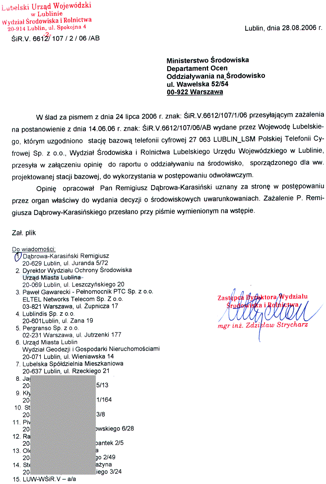 Lublin, strona główna Położenie Lublina Lublin, Folwarczna 37 4 maj 2006 r., Wydział Ochrony Środowiska zawiadomienie o postępowaniu administracyjnym 4 maj 2006 r., Wydział Ochrony Środowiska, prośba o uwagi przez wydział Środowiska i Rolnictwa oraz przez PWIS w Lublinie 13 maja, walka z inwazją Ery w Lublinie, hipermarket E. Leclerc Hipermarket E. Leclerc, mapa sytuacji 19 maja 2006, postanowienie PWIS, uzgadniam środowiskowe uwarunkowania dla ERA Nr 27063 Lublin-LSM 5 czerwca 2006 r., prośba PWIS o wydanie raportu 14 czerwca 2006 r., postanowienie Wojewody Lubelskiego 16 czerwca 2006 r., odpowiedź prezydenta miasta Lublin 20 czerwca 2006 r., przekazanie pisma przeciwników budowy masztów ERY do Prezydenta Miasta Lublin Andrzeja Pruszkowskiego Lublin, zdjęcia sytuacji Szczegół, który robi z raportów makulaturę Raport o oddziaływaniu na środowisko, Zana 19, Lublin 17 lipca 2006 r. pismo przedstawiciela 1000 protestujących osób pana Remigiusza Dąbrowa-Karasińskiego do Prezesa Lubelskiej Spółdzielni Mieszkaniowej, .doc, 28 KB 18 lipca 2006 r., Lubelska Spółdzielnia Mieszkanowa zażalenie na postanowienie wojewody lubelskiego z dnia 14.6.2006 r. exTaktyka falszowania raportów Lipiec 2006 r., w sprawie opracowania: "Raport oddziaływania na środowisko" , doc, 272,7 KB 19 lipca 2006, Prezes Spółki "Lublindis" wnosi zażalenie na postanowienie wojewody lubelskiego 26 lipca 2006, pismo do właściciela Pergranso Sp. z o.o. w Warszawie, .doc, 28 KB 21 sierpnia 2006, pierwszy sukces: Główny Inspektor Sanitarny unieważnia decyzję Wojewódzkiego 28 sierpnia 2006 potwierdzenie Remigiusz Karasiński jest stroną w walce przeciwko inwazji ERY 29 września 2006, Lublin-zwycięstwo, potwierdzenie decyzji Wojewódzkiego Inspektora Sanitarnego w Lublinie przez Głównego Inspektora Sanitarnego Andrzeja Wojtyłę |