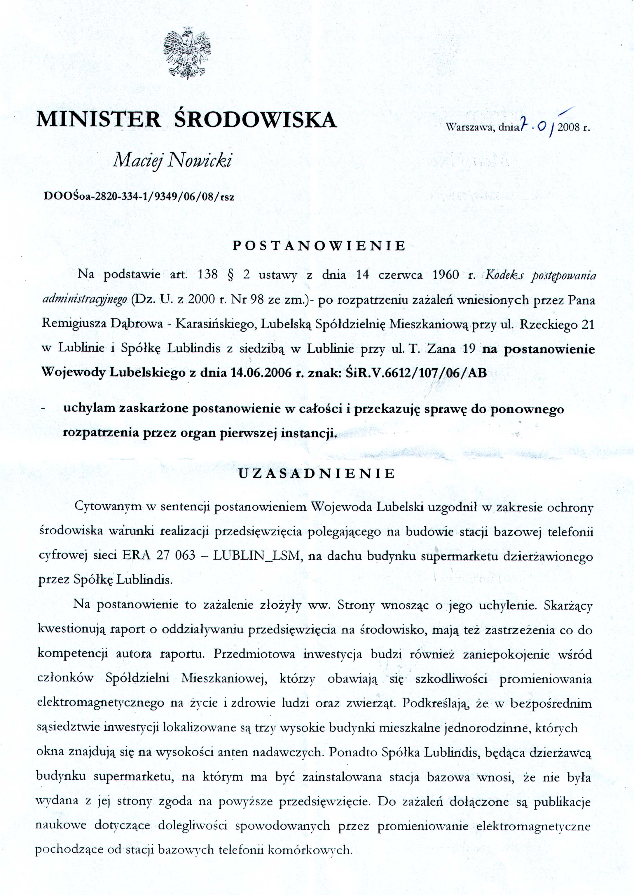 Ministerstwa Środowiska uchyla decyzję Wojewody Lubelskiego w sprawie wydania zgody na budowę anten na dachu hipermarketu E.Leclerc w Lublinie. 28.5.08 Krzysztof Puzyna |