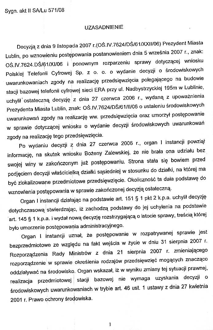 Lublin. Sygn. akt II SA/Lu 571/08 - Wyrok WSA w Lublinie, Data orzecz enia 2008-12-16, wpłynęło 09.01.2009r. Wynik: Uchylono decyzję I i II instancji, Uzasadnienie wyroku: Organ I instancji uznał, że postępowanie w rozpatrywanej sprawie jest bezprzedmiotowe ze względu na fakt wejścia w życie w dniu 31 sierpnia 2007 r. Rozporządzenia Rady Ministrów z dnia 21 sierpnia 2007 r. zmieniającego rozporządzenie w sprawie określenia rodzajów przedsięwzięć mogących znacząco oddziaływać na środowisko. Organ wskazał, iż w wyniku zmiany tej sytuacji prawnej, realizacja przedmiotowej stacji bazowej nie wymaga uzyskania decyzji o środowiskowych uwarunkowaniach w trybie art. 46 ust. 1 ustawy z dnia 27 kwietnia 2001 r. Prawo ochrony środowiska. Stowarzyszenie Ekologiczne Ojczyzna 58-105 Świdnica Lublin. Skarga o uchylenie Decyzji SKO z dnia 30.06.2008r. Załączniki do skargi Strona skarżąca: Stowarzyszenie Ekologiczne Ojczyzna 58-105 Świdnica Strona przeciwna: Samorządowe Kolegium Odwoławcze w Lublinie ul. Zana 38c |