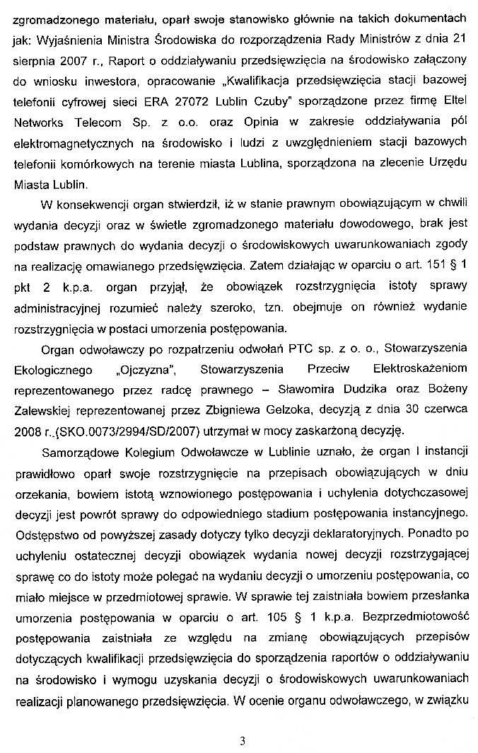 Lublin. Sygn. akt II SA/Lu 571/08 - Wyrok WSA w Lublinie, Data orzecz enia 2008-12-16, wpłynęło 09.01.2009r. Wynik: Uchylono decyzję I i II instancji, Uzasadnienie wyroku c.d. : Lublin. Sygn. akt II SA/Lu 571/08 - Wyrok WSA w Lublinie, Data orzeczenia 2008-12-16, wpłynęło 09.01.2009r. Uzasadnienie wyroku c.d. : W konsekwencji organ stwierdził, iż w stanie prawnym obowiązującym w chwili wydania decyzji oraz w świetle zgromadzonego materiału dowodowego, brak jest podstaw prawnych do wydania decyzji o środowiskowych uwarunkowaniach zgody na realizację omawianego przedsięwzięcia. Zatem działając w oparciu o art. 151 § 1 pkt 2 k.p.a. organ przyjął, że obowiązek rozstrzygnięcia istoty sprawy administracyjnej rozumieć należy szeroko, tzn. obejmuje on również wydanie rozstrzygnięcia w postaci umorzenia postępowania. Organ odwoławczy po rozpatrzeniu odwołań PTC sp. z o. o., Stowarzyszenia Ekologicznego Ojczyzna., Stowarzyszenia PPrzeciw Elektroskażeniom reprezentowanego przez radcę prawnego - Sławomira Dudzika oraz Bożeny Zalewskiej reprezentowanej przez Zbigniewa Gelzoka, decyzją z dnia 30 czerwca 2008 r., (nr SKO.0073/2994/SD/2007) utrzymał w mocy zaskarżoną decyzję. Stowarzyszenie Ekologiczne Ojczyzna 58-105 Świdnica Lublin. Skarga o uchylenie Decyzji SKO z dnia 30.06.2008r. Załączniki do skargi Strona skarżąca: Stowarzyszenie Ekologiczne Ojczyzna 58-105 Świdnica Strona przeciwna: Samorządowe Kolegium Odwoławcze w Lublinie ul. Zana 38c | ||||||||||