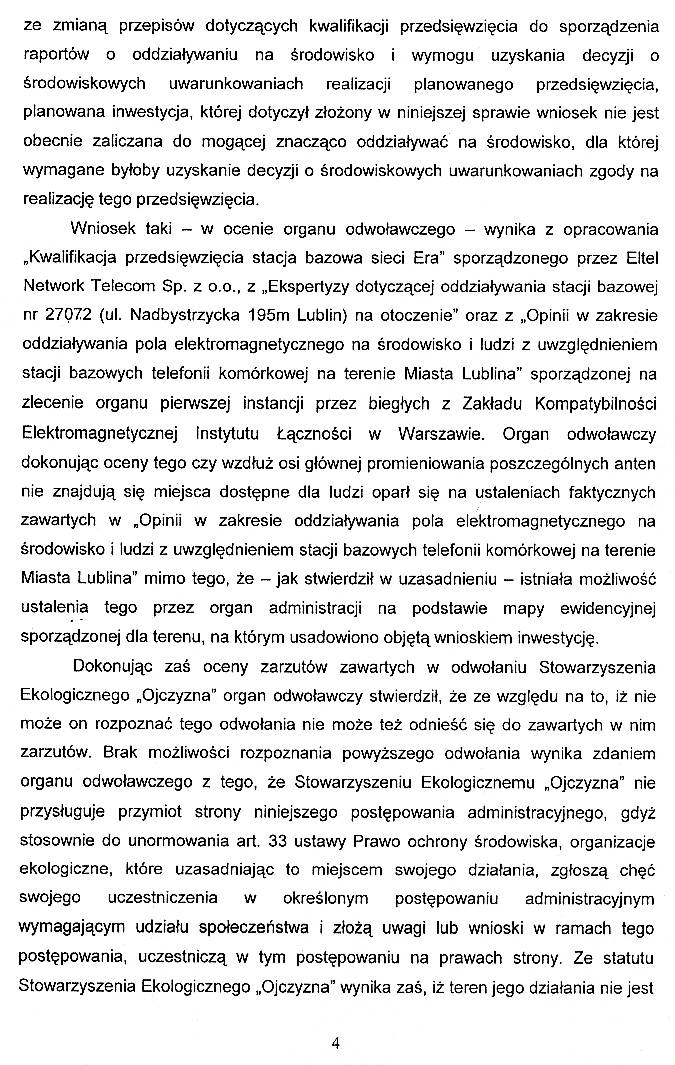 Lublin. Sygn. akt II SA/Lu 571/08 - Wyrok WSA w Lublinie, Data orzecz enia 2008-12-16, wpłynęło 09.01.2009r. Wynik: Uchylono decyzję I i II instancji, Uzasadnienie wyroku c.d. : Dokonując zaś oceny zarzutów zawartych w odwołaniu Stowarzyszenia Ekologicznego "O." organ odwoławczy stwierdził, że ze względu na to, iż nie może on rozpoznać tego odwołania nie może też odnieść się do zawartych w nim zarzutów. Brak możliwości rozpoznania powyższego odwołania wynika zdaniem organu odwoławczego z tego, że Stowarzyszeniu Ekologicznemu Ojczyzna nie przysługuje przymiot strony niniejszego postępowania administracyjnego, gdyż stosownie do unormowania art. 33 ustawy Prawo ochrony środowiska, organizacje ekologiczne, które uzasadniając to miejscem swojego działania, zgłoszą chęć swojego uczestniczenia w określonym postępowaniu administracyjnym wymagającym udziału społeczeństwa i złożą uwagi lub wnioski w ramach tego postępowania, uczestniczą w tym postępowaniu na prawach strony. Ze statutu Stowarzyszenia Ekologicznego "Oiczyzna" wynika zaś, iż teren jego działania nie jest tożsamy z miejscem, na którym usadowiona jest inwestycja, której dotyczy niniejsze postępowanie. Stowarzyszenie Ekologiczne Ojczyzna 58-105 Świdnica Lublin. Skarga o uchylenie Decyzji SKO z dnia 30.06.2008r. Załączniki do skargi Strona skarżąca: Stowarzyszenie Ekologiczne Ojczyzna 58-105 Świdnica Strona przeciwna: Samorządowe Kolegium Odwoławcze w Lublinie ul. Zana 38c | ||||||||||