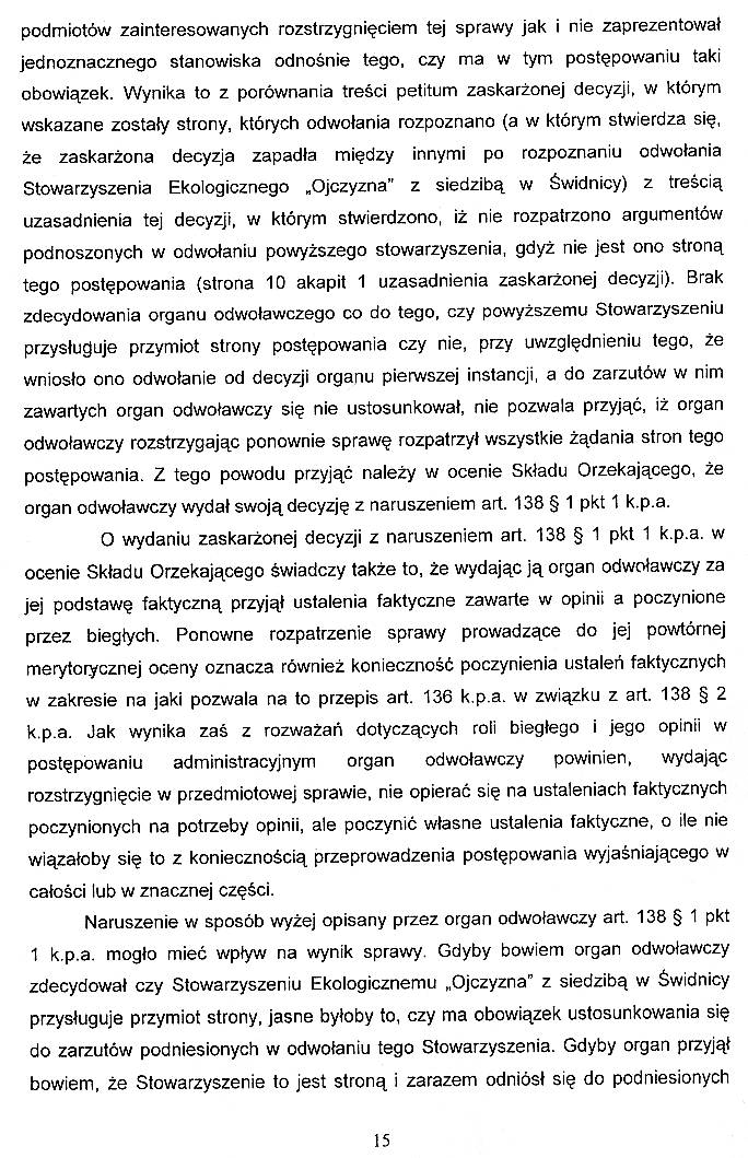 Lublin. Sygn. akt II SA/Lu 571/08 - Wyrok WSA w Lublinie, Data orzecz enia 2008-12-16, wpłynęło 09.01.2009r. Wynik: Uchylono decyzję I i II instancji, Uzasadnienie wyroku c.d. : Jak wynika zaś z rozważań dotyczących roli biegłego i jego opinii w postępowaniu administracyjnym organ odwoławczy powinien, wydając rozstrzygnięcie w przedmiotowej sprawie, nie opierać się na ustaleniach faktycznych poczynionych na potrzeby opinii, ale poczynić własne ustalenia faktyczne, o ile nie wiązałoby się to z koniecznością przeprowadzenia postępowania wyjaśniającego w całości lub w znacznej części. Naruszenie w sposób wyżej opisany przez organ odwoławczy art. 138 § 1 pkt 1 k.p.a. mogło mieć wpływ na wynik sprawy. Gdyby bowiem organ odwoławczy zdecydował czy Stowarzyszeniu Ekologicznemu "Ojczyzna." z siedzibą w Świdnicy przysługuje przymiot strony, jasne byłoby to, czy ma obowiązek ustosunkowania się do zarzutów podniesionych w odwołaniu tego Stowarzyszenia. Gdyby organ przyjął bowiem, że Stowarzyszenie to jest stroną i zarazem odniósł się do podniesionych przezeń zarzutów, nie można wykluczyć, że wydałby inne rozstrzygniecie. Stowarzyszenie Ekologiczne Ojczyzna 58-105 Świdnica Lublin. Skarga o uchylenie Decyzji SKO z dnia 30.06.2008r. Załączniki do skargi Strona skarżąca: Stowarzyszenie Ekologiczne Ojczyzna 58-105 Świdnica Strona przeciwna: Samorządowe Kolegium Odwoławcze w Lublinie ul. Zana 38c | ||||||||||