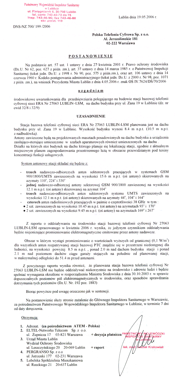 Lublin, strona główna Położenie Lublina Lublin, Folwarczna 37 4 maj 2006 r., Wydział Ochrony Środowiska zawiadomienie o postępowaniu administracyjnym 4 maj 2006 r., Wydział Ochrony Środowiska, prośba o uwagi przez wydział Środowiska i Rolnictwa oraz przez PWIS w Lublinie 13 maja, walka z inwazją Ery w Lublinie, hipermarket E. Leclerc Hipermarket E. Leclerc, mapa sytuacji 19 maja 2006, postanowienie PWIS, uzgadniam środowiskowe uwarunkowania dla ERA Nr 27063 Lublin-LSM 5 czerwca 2006 r., prośba PWIS o wydanie raportu 14 czerwca 2006 r., postanowienie Wojewody Lubelskiego 16 czerwca 2006 r., odpowiedź prezydenta miasta Lublin 20 czerwca 2006 r., przekazanie pisma przeciwników budowy masztów ERY do Prezydenta Miasta Lublin Andrzeja Pruszkowskiego Lublin, zdjęcia sytuacji Szczegół, który robi z raportów makulaturę Raport o oddziaływaniu na środowisko, Zana 19, Lublin 17 lipca 2006 r. pismo przedstawiciela 1000 protestujących osób pana Remigiusza Dąbrowa-Karasińskiego do Prezesa Lubelskiej Spółdzielni Mieszkaniowej, .doc, 28 KB 18 lipca 2006 r., Lubelska Spółdzielnia Mieszkanowa zażalenie na postanowienie wojewody lubelskiego z dnia 14.6.2006 r. exTaktyka falszowania raportów Lipiec 2006 r., w sprawie opracowania: "Raport oddziaływania na środowisko" , doc, 272,7 KB 19 lipca 2006, Prezes Spółki "Lublindis" wnosi zażalenie na postanowienie wojewody lubelskiego 26 lipca 2006, pismo do właściciela Pergranso Sp. z o.o. w Warszawie, .doc, 28 KB 21 sierpnia 2006, pierwszy sukces: Główny Inspektor Sanitarny unieważnia decyzję Wojewódzkiego 28 sierpnia 2006 potwierdzenie Remigiusz Karasiński jest stroną w walce przeciwko inwazji ERY 29 września 2006, Lublin-zwycięstwo, potwierdzenie decyzji Wojewódzkiego Inspektora Sanitarnego w Lublinie przez Głównego Inspektora Sanitarnego Andrzeja Wojtyłę |