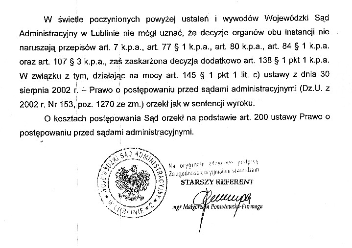 Lublin. Sygn. akt II SA/Lu 571/08 - Wyrok WSA w Lublinie, Data orzecz enia 2008-12-16, wpłynęło 09.01.2009r. Wynik: Uchylono decyzję I i II instancji, Uzasadnienie wyroku c.d. : W świetle poczynionych powyżej ustaleń i wywodów Wojewódzki Sąd Administracyjny w Lublinie nie mógł uznać, że decyzje organów obu instancji nie naruszają przepisów art. 7 k.p.a., art. 77 § 1 k.p.a., art. 80 k.p.a., art. 84 § 1 k.p.a. oraz art. 107 § 3 k.p.a., zaś zaskarżona decyzja dodatkowo art. 138 § 1 pkt 1 k.p.a. W związku z tym, działając na mocy art. 145 § 1 pkt 1 lit. c) ustawy z dnia 30 sierpnia 2002 r. - Prawo o postępowaniu przed sądami administracyjnymi (Dz.U. z 2002 r. Nr 153, poz. 1270 ze zm.) orzekł jak w sentencji wyroku. O kosztach postępowania Sąd orzekł na podstawie art. 200 ustawy Prawo o postępowaniu przed sądami administracyjnymi. Stowarzyszenie Ekologiczne Ojczyzna 58-105 Świdnica Lublin. Skarga o uchylenie Decyzji SKO z dnia 30.06.2008r. Załączniki do skargi Strona skarżąca: Stowarzyszenie Ekologiczne Ojczyzna 58-105 Świdnica Strona przeciwna: Samorządowe Kolegium Odwoławcze w Lublinie ul. Zana 38c |
