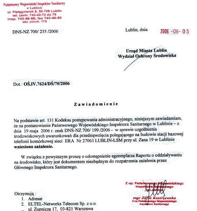 Lublin, strona główna Położenie Lublina Lublin, Folwarczna 37 4 maj 2006 r., Wydział Ochrony Środowiska zawiadomienie o postępowaniu administracyjnym 4 maj 2006 r., Wydział Ochrony Środowiska, prośba o uwagi przez wydział Środowiska i Rolnictwa oraz przez PWIS w Lublinie 13 maja, walka z inwazją Ery w Lublinie, hipermarket E. Leclerc Hipermarket E. Leclerc, mapa sytuacji 19 maja 2006, postanowienie PWIS, uzgadniam środowiskowe uwarunkowania dla ERA Nr 27063 Lublin-LSM 5 czerwca 2006 r., prośba PWIS o wydanie raportu 14 czerwca 2006 r., postanowienie Wojewody Lubelskiego 16 czerwca 2006 r., odpowiedź prezydenta miasta Lublin 20 czerwca 2006 r., przekazanie pisma przeciwników budowy masztów ERY do Prezydenta Miasta Lublin Andrzeja Pruszkowskiego Lublin, zdjęcia sytuacji Szczegół, który robi z raportów makulaturę Raport o oddziaływaniu na środowisko, Zana 19, Lublin 17 lipca 2006 r. pismo przedstawiciela 1000 protestujących osób pana Remigiusza Dąbrowa-Karasińskiego do Prezesa Lubelskiej Spółdzielni Mieszkaniowej, .doc, 28 KB 18 lipca 2006 r., Lubelska Spółdzielnia Mieszkanowa zażalenie na postanowienie wojewody lubelskiego z dnia 14.6.2006 r. exTaktyka falszowania raportów Lipiec 2006 r., w sprawie opracowania: "Raport oddziaływania na środowisko" , doc, 272,7 KB 19 lipca 2006, Prezes Spółki "Lublindis" wnosi zażalenie na postanowienie wojewody lubelskiego 26 lipca 2006, pismo do właściciela Pergranso Sp. z o.o. w Warszawie, .doc, 28 KB 21 sierpnia 2006, pierwszy sukces: Główny Inspektor Sanitarny unieważnia decyzję Wojewódzkiego 28 sierpnia 2006 potwierdzenie Remigiusz Karasiński jest stroną w walce przeciwko inwazji ERY 29 września 2006, Lublin-zwycięstwo, potwierdzenie decyzji Wojewódzkiego Inspektora Sanitarnego w Lublinie przez Głównego Inspektora Sanitarnego Andrzeja Wojtyłę |
