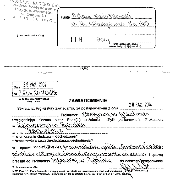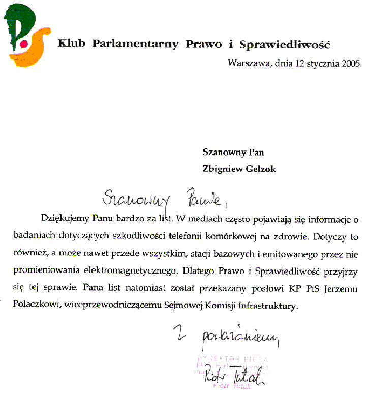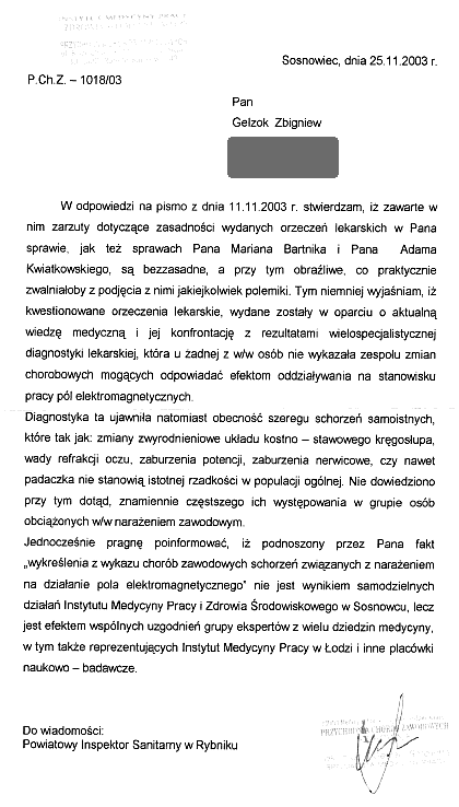 Prezes Zarządu ERA GSMW związku z twierdzeniem pana Jerzego Hawro prezesa "GAWINEX" złożonym już niejednokrotnie przed Sądem również w dniu 2004-11-10 iż za narażenie pracowników na działanie pola elektromagnetycznego odpowiedzialność ponoszą inwestorzy z racji, że to na ich stacjach doszło do szkodliwej i niebezpiecznej ekspozycji pracowników informuję jako osoba poszkodowana oraz przedstawiciel osób poszkodowanych i członek Stowarzyszenia Przeciwko Elektroskażeniom, że zgadzam się z prezesem i wszystkie kroki skierowane zostaną przeciwko operatorom, którzy co potwierdzone jest w Rybniku zatrudniali firmę nie posiadająca uprawnień do zatrudniania pracowników w narażeniu na działanie pola elektromagnetycznego oraz wiedząc nie poinformowali ich, że pole elektromagnetyczne jest szkodliwe i niebezpieczne. W związku z powyższym zostaniecie na pewno oskarżeni z art. 160 KK oraz z związku z opinią biegłego sądowego potwierdzającego szkodliwość pola elektromagnetycznego oraz uszczerbek u montera i fakt, iż jeszcze kilka osób doznało uszczerbku takiego samego będziemy wnosić doniesienie o popełnienie zbrodni w stosunku do monterów "GAWINEX". Jako osoba znająca wszystkie okoliczności i zgodnie z opinią biegłego mogę z całą odpowiedzialnością również stwierdzić, że prowadzicie działalność na terenie Polski bez zapewnienia, iż pole elektromagnetyczne jest nieszkodliwe a ja posiadam dowody, iż pole elektromagnetyczne jest szkodliwe, jest kilkaset osób poszkodowanych i tym samym operator prowadzi działalność wymierzoną w naród Polski. Takie jest moje stanowisko i jeżeli się nie zgadzacie powinniście podjąć kroki zmierzające do wyjaśnienia powyższego tym bardziej, że radca prawny Premiera Rzeczypospolitej uznał stacje bazowe jako szkodliwe i podaje podstawy prawne jak je zlikwidować. W związku z opinią natychmiast zwrócimy się do władz kościelnych o natychmiastowe zlikwidowanie wszystkich stacji bazowych na kościołach, ponieważ sprawa dotyczy rozrodczości i tego na pewno nie mogą zlekceważyć tym bardziej, że Papież Jan Paweł II i Watykan są przeciwni, aby wymieniane stacje znajdowały się na kościołach, niejednokrotnie bardzo dobrze ukryte, co wiem, bo je robiłem i to opiszę. Pozostałe informacje na stronie internetowej iddd.de gdzie każdy Polak może poznać prawdziwe oblicze telefonii komórkowej oraz wkrótce rozbudowane strona gelzok.w.interia.pl. Powinniście podziękować panu Hawro, że wraz z wami poświęcił zdrowie monterów, lecz może to pozwoli uratować zdrowie i życie milionów Polaków. Rybnik 2004-11-02 Gelzok Zbigniew |