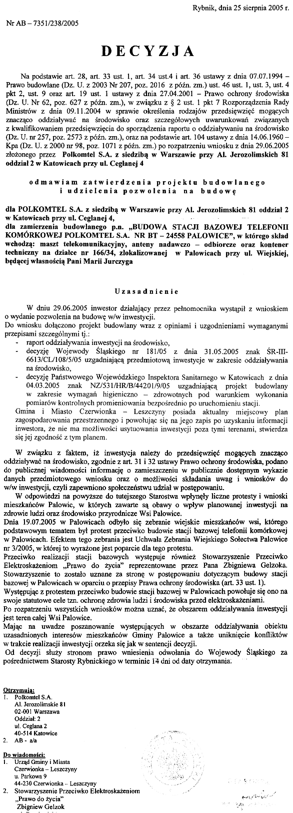Dokument Prezydenta Miasta Rybnika z którego jasno wynika, że urzędnik Janusz Piekarczyk zlekceważył mieszkańców Ochojca, okłamał Prezydenta w tamtej sprawie oraz Pan Prezydent Miasta Rybnik Adam Fudali przyznaje, że legalizacja montażu stacji bazowych telefonii komórkowej opiera się o pozwoleniu na budowę, a nie na zgłoszeniu, co podkreślił w piśmie. Nieuznawanie stowarzyszenia za stronę to sprawa pana Adama Wolnego z Urzędu Wojewódzkiego, który jest na usługach operatorów i to nie podlega dyskusji, dla nich łamie prawo. Pozdrawiam Zbigniew Gelzok. 01 Jul 2005 patrz odpowiedź prezydenta, pdf, 128 KB |