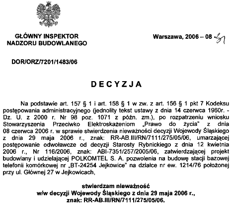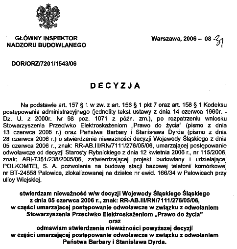 ![]() 10 lipca 2006 r. Decyzja Głównego Inspektora Sanitarnego jest bardzo ważna. Pozdrawiam Zbigniew Gelzok DECYZJA Na podstawie art. 158 § 1, w związku z art. 156 § 1 p. 2 Kodeksu postępowania administracyjnego stwierdzam z urzędu nieważność decyzji Państwowego Wojewódzkiego Inspektora Sanitarnego w Katowicach z dnia 28 czerwca 2002 r., znak: ZE/531-401/88/2002 uzgadniającej pozytywnie w zakresie ochrony ludzi i środowiska przed promieniowaniem elektromagnetycznym projekt budowy stacji bazowej telefonii komórkowej nr 5063 systemu GSM 900 MHz oraz DCS 1800 MHz sieci "IDEA" przewidzianej do zainstalowania na wieży kościelnej przy ul. Boryńskiej 45 w Żorach. plik do pobrania, .pdf, 162,8 KB | ||