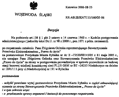 ![]() Organizacja Prawo do Życia jest stroną także w Żorach ! Katowice 7 lipca 2006 Samorządowe Kolegium Odwoławcze w Katowicach w składzie: Przewodnicząca: Beata Leszczyńska - sprawozdawca Członkowie: Bozena Miliczek-Ciszewska Anna Kajzerek po rozpatrzeniu odwołania Stowarzyszenia Przeciwko Elektroskażeniom "Prawo do zycia" Gelzok Zbigniew z siedzibą w Rybniku, ul. Bracka 16A od decyzji Prezydenta Miasta Żory z dnia 14 kwietnia 2006r., o nr IKOS.ROSiR.DS.7617 - 19/05/06 w sprawie: ustalenia środowiskowych uwarunkowań zgody na realizację przedsięwzięcia pn: "Budowa stacji bazowej telefonii komórkowej nr 5963 zlokalizowanej na dachu budynku hipermarketu Auchan oraz wewnątrz tego budynku przy ul. Francuskiej 11 w Żorach" na posiedzeniu w dniu 7 lipca 2006 roku orzekło uchylić zaskarzoną decyzję w całości i przekazać sprawę do ponownego rozpatrzenia organowi pierwszej instancji plik do pobrania, .pdf, 176,2 KB | ||