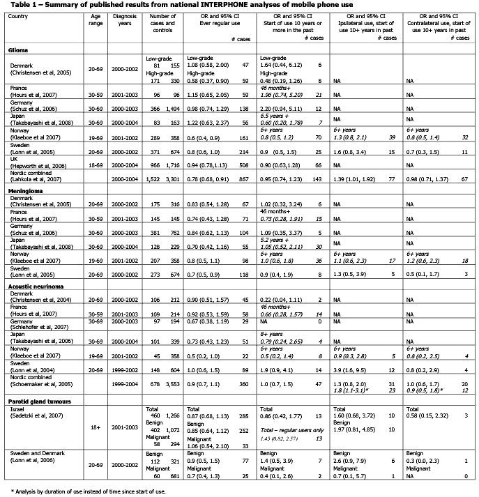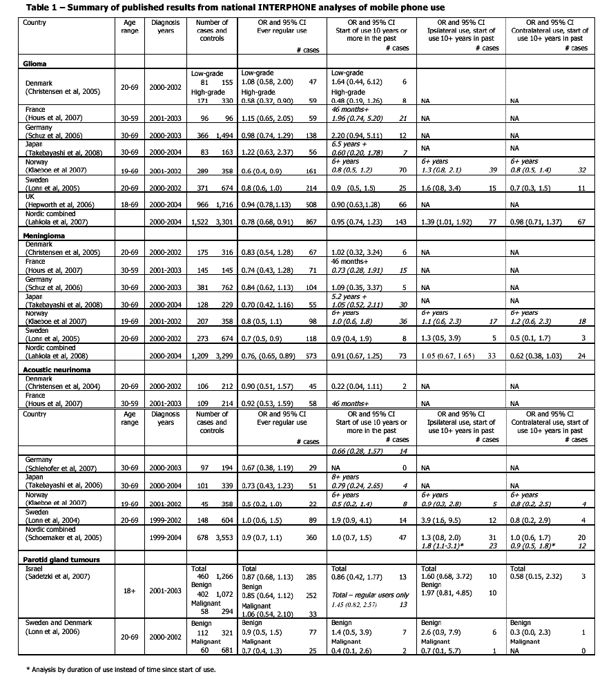 The international Interphone study confirms : "THE USE OF MOBILE PHONE IS CANCEROGENIC" The official publication on the 8th of October 2008 - mostly in catimini- of the first intermediate results of the International Interphone Study from the International Research Centre on cancer dependent on WHO confirms the increased tumors and cancer cases due to the use of mobile phone. The International Epidemiologic Research Study was gathering 13 countries (Germany, Australia, Canada, Denmark, Finland, France, Israel, Italy, Japan, Norway, New-Zeeland, United Kingdom and Sweden) who were using the same protocol in order to look for a possible relation between tumours and hyper frequency micro wave?s radiations. These tumours are mainly acoustic neurinoma, meningioma, glioma, parotid gland tumours, etc? . | |||||||