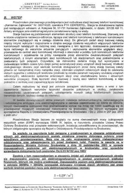 Wstęp. Raport o oddziaływaniu przedsięwzięcia na środowisko nr RO 149/06/RONS rozbudowa stacji bazowej nr 3837/4325 "Kamieniec Ząbkowicki" PTK Centertel Orange (France Telecom) w Kamieńcu Ząbkowickim. EIRP "jest?" 15968 W (>100 W), Nr działki 301/26 AM 11, 57-731 Kamieniec Ząbkowicki, Kolejowa 56, autorem opracowania jest mgr inż. Robert Surma, mai 2006, Grinvest. puknięcie powoduje powiększenie | ||