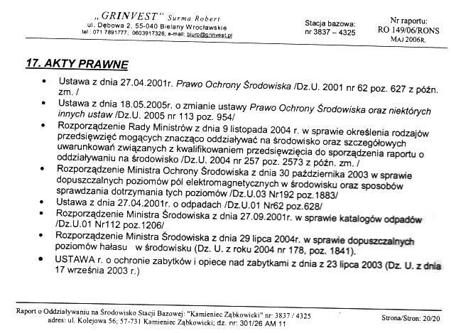 | Akty prawne. Raport o oddziaływaniu przedsięwzięcia na środowisko nr RO 149/06/RONS rozbudowa stacji bazowej nr 3837/4325 "Kamieniec Ząbkowicki" PTK Centertel Orange (France Telecom) w Kamieńcu Ząbkowickim. EIRP "jest?" 15968 W (>100 W), Nr działki 301/26 AM 11, 57-731 Kamieniec Ząbkowicki, Kolejowa 56, autorem opracowania jest mgr inż. Robert Surma, mai 2006, Grinvest. | ||