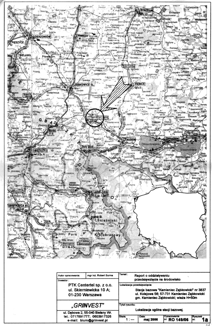 | Lokalizacja ogólna stacji bazowej. Raport o oddziaływaniu przedsięwzięcia na środowisko nr RO 149/06/RONS rozbudowa stacji bazowej nr 3837/4325 "Kamieniec Ząbkowicki" PTK Centertel Orange (France Telecom) w Kamieńcu Ząbkowickim. EIRP "jest?" 15968 W (>100 W), Nr działki 301/26 AM 11, 57-731 Kamieniec Ząbkowicki, Kolejowa 56, autorem opracowania jest mgr inż. Robert Surma, mai 2006, Grinvest. | ||