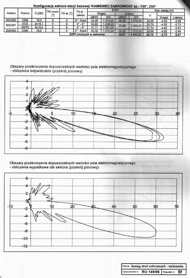 Konfiguracja sektora az.:130 grad, 250 grad. Tilt mech. 8° Tilt el. 8°. Zasięg stref ochronnych. Obszary przekroczenia dopuszczalnych wartości pola elektromagnetycznego - przekrój pionowy, obliczenia indywidualne, obliczenia wypadkowe dla sektora. Raport o oddziaływaniu przedsięwzięcia na środowisko nr RO 149/06/RONS rozbudowa stacji bazowej nr 3837/4325 "Kamieniec Ząbkowicki" PTK Centertel Orange (France Telecom) w Kamieńcu Ząbkowickim. EIRP "jest?" 15968 W (>100 W), Nr działki 301/26 AM 11, 57-731 Kamieniec Ząbkowicki, Kolejowa 56, autorem opracowania jest mgr inż. Robert Surma, mai 2006, Grinvest. puknięcie powoduje powiększenie | ||