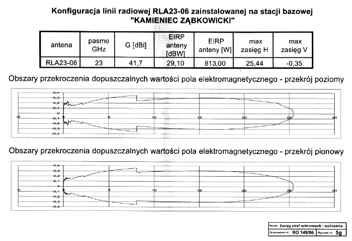 Konfiguracja linii radioliniowej RLA23-06 zainstalowanej na stacji bazowej "Kamieniec Ząbkowicki". Obszary przekroczenia dopuszczalnych wartości pola elektromagnetycznego - przekrój poziomy i pionowy. Raport o oddziaływaniu przedsięwzięcia na środowisko nr RO 149/06/RONS rozbudowa stacji bazowej nr 3837/4325 "Kamieniec Ząbkowicki" PTK Centertel Orange (France Telecom) w Kamieńcu Ząbkowickim. EIRP "jest?" 15968 W (>100 W), Nr działki 301/26 AM 11, 57-731 Kamieniec Ząbkowicki, Kolejowa 56, autorem opracowania jest mgr inż. Robert Surma, mai 2006, Grinvest. puknięcie powoduje powiększenie | ||