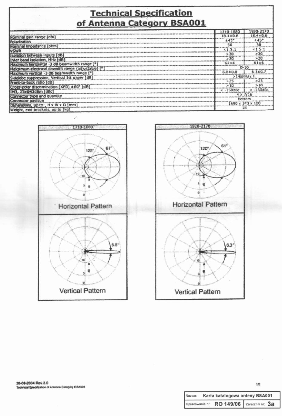 Technical Specification of Antenna Category BSA001 Raport o oddziaływaniu przedsięwzięcia na środowisko nr RO 149/06/RONS rozbudowa stacji bazowej nr 3837/4325 "Kamieniec Ząbkowicki" PTK Centertel Orange (France Telecom) w Kamieńcu Ząbkowickim. EIRP "jest?" 15968 W (>100 W), Nr działki 301/26 AM 11, 57-731 Kamieniec Ząbkowicki, Kolejowa 56, autorem opracowania jest mgr inż. Robert Surma, mai 2006, Grinvest. | ||