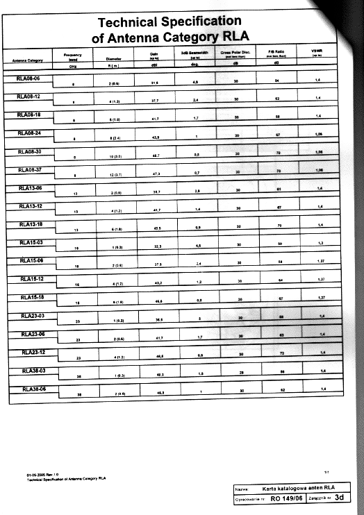 Technical Specification of Antenna Category RLA. Raport o oddziaływaniu przedsięwzięcia na środowisko nr RO 149/06/RONS rozbudowa stacji bazowej nr 3837/4325 "Kamieniec Ząbkowicki" PTK Centertel Orange (France Telecom) w Kamieńcu Ząbkowickim. EIRP "jest?" 15968 W (>100 W), Nr działki 301/26 AM 11, 57-731 Kamieniec Ząbkowicki, Kolejowa 56, autorem opracowania jest mgr inż. Robert Surma, mai 2006, Grinvest. puknięcie powoduje powiększenie | ||