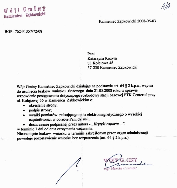 Urząd Gminy w Kamieńcu Ząbkowickim, Kamieniec Ząbkowicki 13.11.2008 BGP-BA 7624/1357/72/189/08 Pani Katarzyna Kozyra ul. Kolejowa 48 57-230 Kamieniec Ząbkowicki W nawiązaniu do złożonego przez Panią pisma z dnia 20.10.2008 r. w Urzędzie Gminy w Kamieńcu Ząbkowickim Wójt Gminy Kamieniec Ząbkowicki (przyp. red. umtsno: on nazywa się Marcin Czerniec) wzywa do usunięcia braków wniosku złożonego dnia 21.05.2008 r. w sprawie wznowienia postępowania dotyczącego rozbudowy stacji bazowej PTK Centertel (przyp. red. umtsno - właścicielem jest francuzki globalny koncern telekomunikacyjny France Telecom przez operatora sieci Orange.) przy ulicy Kolejowej 56 w Kamieńcu Ząbkowickim - o określenie strony, podpis pod wnioskiem, podpis pod wnioskiem, dostarczenie podpisanej przez autora "Krytyki raportu.." w terminie 7 dni od dnia otrzymania wezwania. Wójt Czerniec to niepoważny urzędnik? Dla wójta Marcina Czerniec warunkiem wznowienia postępowania nie są fakty zawarte w raporcie tylko względy formalne. Jego wymóg 7 dni czasu dla odpowiedzi dla okrężnej przesyłki to farsa ! - najpierw dostała ją w ciągu tygodnia pani Kozyra-Matka, która podała list do córki ta dalej do Hamburga - tu trzeba liczyć 10 dni dla Hamburga, następnie 3 tygodnie dla eksperta, który potrzebuje czasu dla usunięcia braków nawet jeśli wadą do poprawy była błędna interpretacja pani Kozyry i następnie wójta M.C. co jest raportem Krzysztofa Puzyny a co jest tylko pisemną pomocą - gotowiec zestawienia argumentów zdrowotnych dla pani Katarzyny Kozyry, która ona sama mogła podpisać. Dla wyprostowania nieporozumienia autor Krytyki Raportu K.P. wysłał do pani Katarzyna Kozyra wydrukowaną i podpisaną przez Krzysztofa Puzynę "Krytykę Raportu" w wersji autorskiej zawierającej głównie kryminalne wady raportu o oddziaływaniu stacji bazowej nr 3837/4325 PTK Centertel Orange (France Telecom) To kosztowało sporo czasu, gdyż pani Katarzyna Kozyra nie jest jedyną osobą, której pomaga Krzysztof Puzyna. Termin 6 tygodni na usunięcie wad formalnych byłby jakimś sygnałem poważności, że chodzi o uczciwą grę urzędu gminy Kamieniec Ząbkowicki. Ale ta gra nie jest uczciwa, gdyż wójt Marcin Czerniec dostał obiektywne fakty o sfałszowaniu dokumentacji. Dlatego czy tam był podpis Kozyry czy Puzyny, czy od Kozyry matki i córki i od eksperta Puzyny czy nie, fakty o istotnie zmienionych parametrach -nastawienia anten, które potwierdziły badania kontrolne, powinny prowadzić do dochodzenia prawdy z urzędu. Wójt Marcin Czerniec albo dostał łapówkę i zasłonił oczy by nie interpretować danych technicznych albo jest do interpretacji technicznego raportu za głupi - w obu przypadkach nie nadaje się on do reprezentacji interesów mieszkańców Kamieńca Ząbkowickiego. Rada: zrobić zażalenie o bezczynności wójta w sprawie doniesionego mu przestępstwa do sądu administracyjnego. Istotne fakty w krytyce raportu potwierdziło badanie kontrolne, które mając dużo wad (patrz tutaj) potwierdza zmianę parametrów technicznych w stosunku do pierwotnych danych w raporcie. 30.08.2009, Krzysztof Puzyna | ||