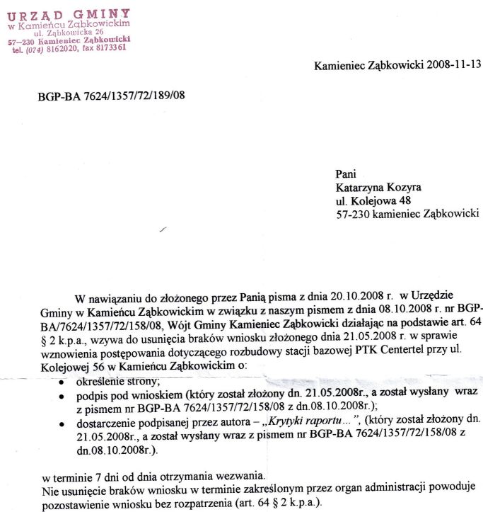 Urząd Gminy w Kamieńcu Ząbkowickim, Kamieniec Ząbkowicki 13.11.2008, Wójt Gminy Kamieniec Ząbkowicki wzywa do usunięcia braków wniosku. | ||