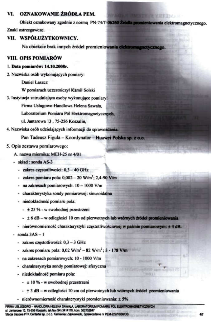 VI. OZNAKOWANIE ŹRÓDŁA PEM. VII. WSPÓŁUŻYTKOWNICY. VIII. OPIS POMIARÓW 1. Data pomiarów: 14.10.2008r. 2. Nazwiska osób wykonujących pomiary: Daniel Łaszcz, w pomiarach uczestniczył Kamil Solski 3. Instytucja zatrudniająca osoby wykonujące pomiary: Firma Usługowo-Handlowa Helena Sawała, Laboratorium Pomiaru Pól Elektromagnetycznych, ul. Jantarowa 13, 75-256 Koszalin, 4. Nazwiska osób udzielających informacji do sprawozdania: Pan Tadeusz Figula-Koordynator-Huawei Polska sp. z o.o. 5. Opis zestawu pomiarowego: A. nazwa miernika: MEH-25 nr 4/01 - skład: sonda AS-3, zakres częstotliwości 0,3-40 GHz - zakres pomiaru pola: 0,002 - 20 W/m2; 2,4-90 V/m - na zakresach pomiarowych: 10 - 1000 V/m | ||
