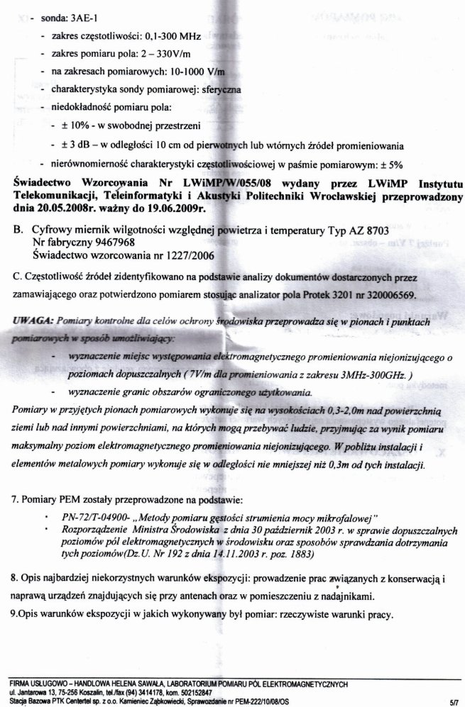 sonda 3AE-1, zakres częstotliwości 0,1-300 MHz - zakres pomiaru pola: 2-330 V/m - na zakresach pomiarowych: 10 - 1000 V/m Świadectwo Wzorcowania Nr LWiMP/W/055/08 wydany przez LWiMP Instytutu Telekomunikacji i Akustyki Politechniki Wrocławskiej przeprowadzony dnia 20.05.2008r. ważny do 19.06.2009r. B. Cyfrowy miernik wilgotności względnej powietrza i temperatury Typ AZ 8703 Nr fabryczny 9467968 Świadectwo wzorcowania nr 1227/2006 C. Częstotliwość źródeł zidentyfikowano na podstawie analizy dokumentów dostarczonych przez zamawiającego oraz potwierdzono pomiarem stosując analizator pola Protek 3201 nr 320006569. 7. Pomiary PEM zostały przeprowadzone na podstawie - PN-72-04900- " Metody pomiaru gęstości strumienia mocy mikrofalowej" - Rozporządzenie Ministra Środowiska z dnia 30 październik 2003 r. w sprawie dopuszczalnych poziomów pól elektromagnetycznych w środowisku oraz sposobów sprawdzania dotrzymania tych poziomów (Dz.U. Nr 192 z dnia 14.11.2003 r. poz. 1883) 8. Opis najbardziej niekorzystnych warunków ekspozycji: prowadzenie prac związanych z konserwacją i naprawą urządzeń znajdujących się przy antenach oraz w pomieszczeniu z nadajnikami. 9. Opis warunków ekspozycji w jakich wykonywany był pomiar: rzeczywiste warunki pracy. | ||